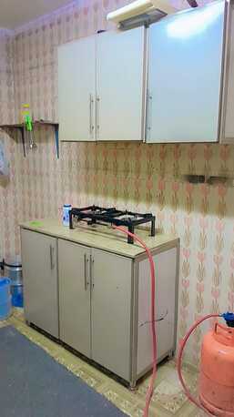 Bed sets, big bed, window AC, fridge, washing machine, fans, and full kitchen setup.
