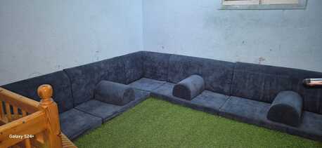 A second room furnished with Arabic majlis seating and a large wardrobe
